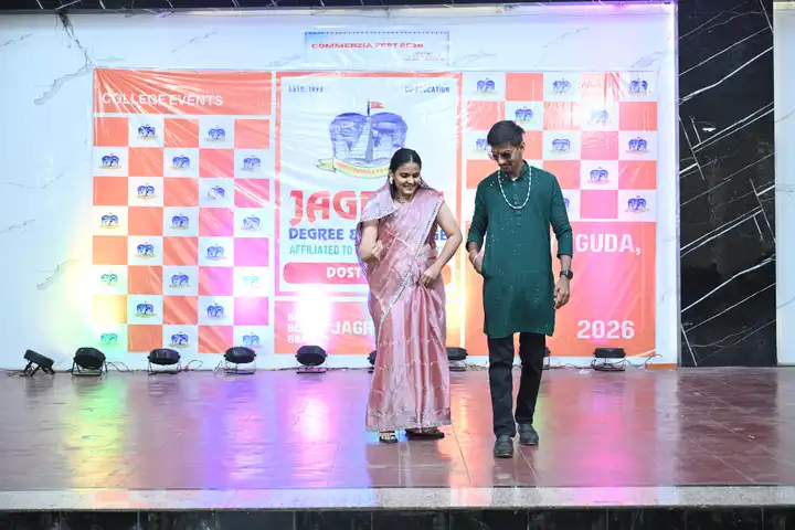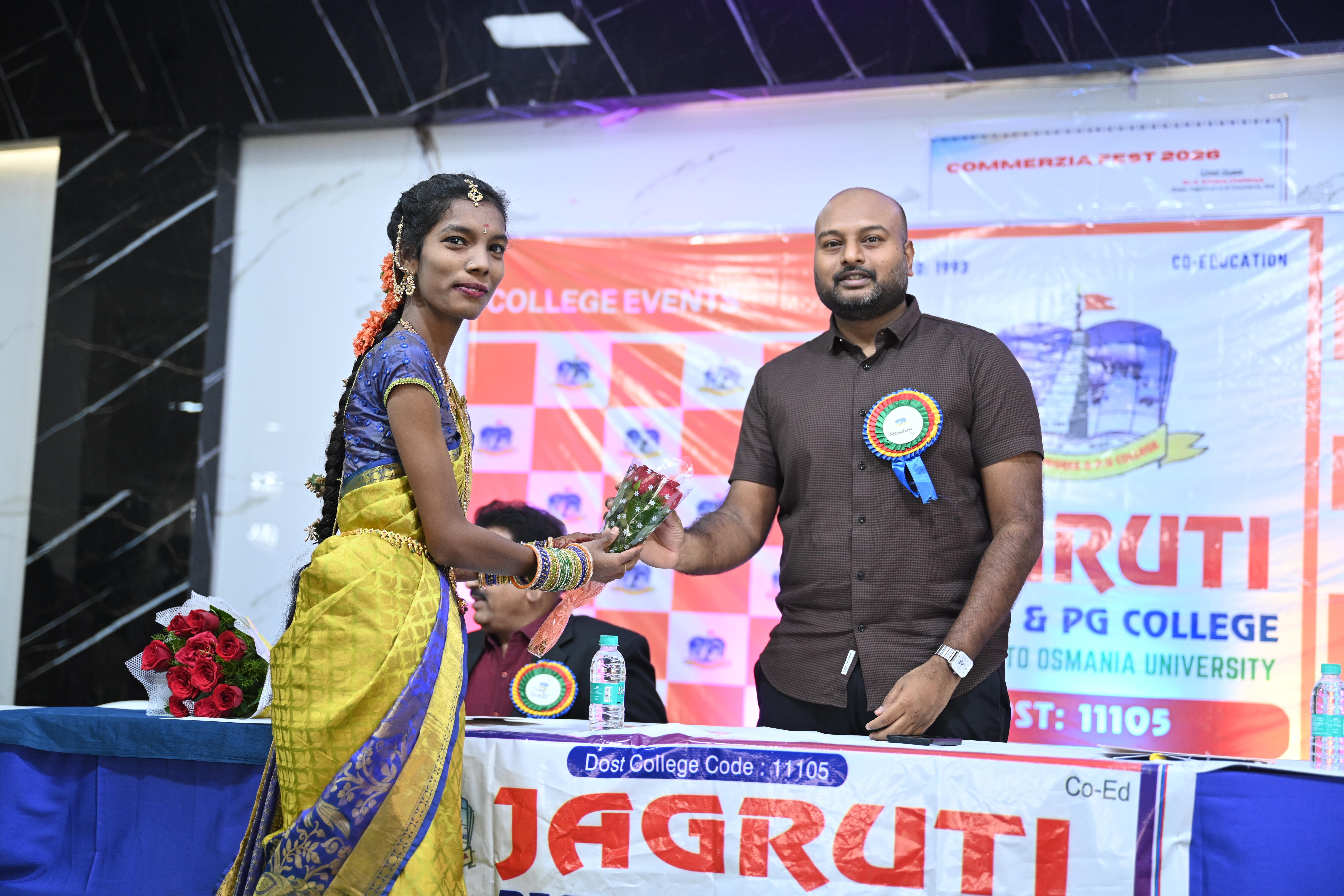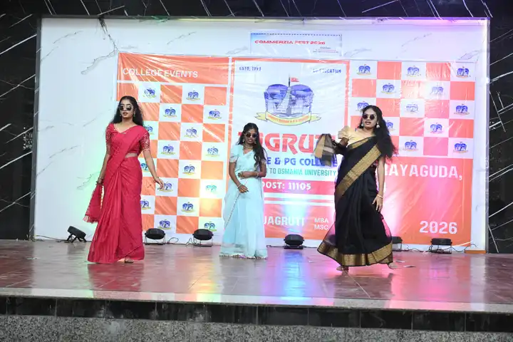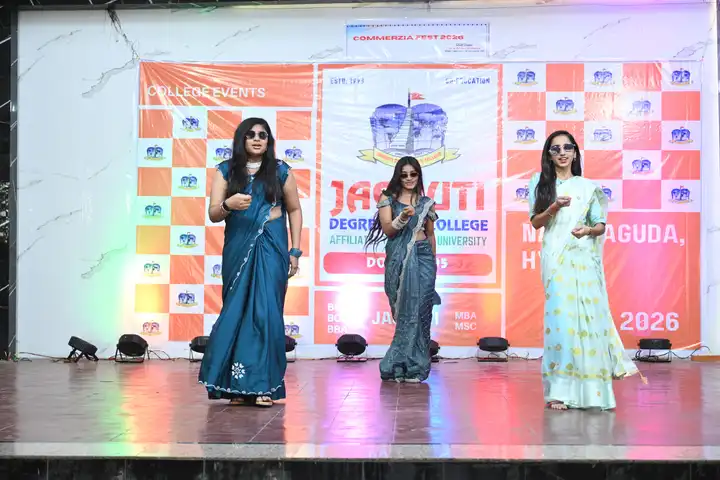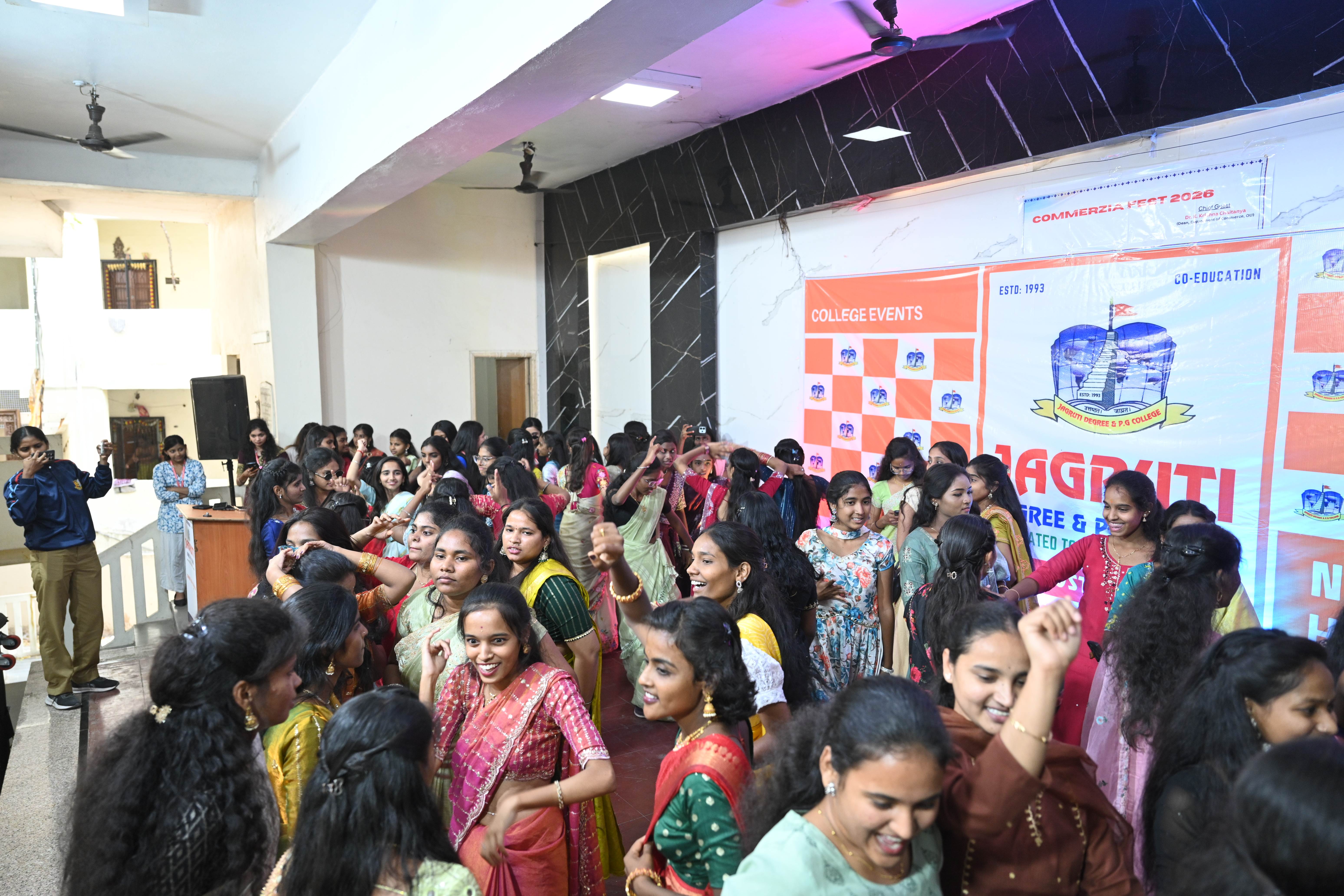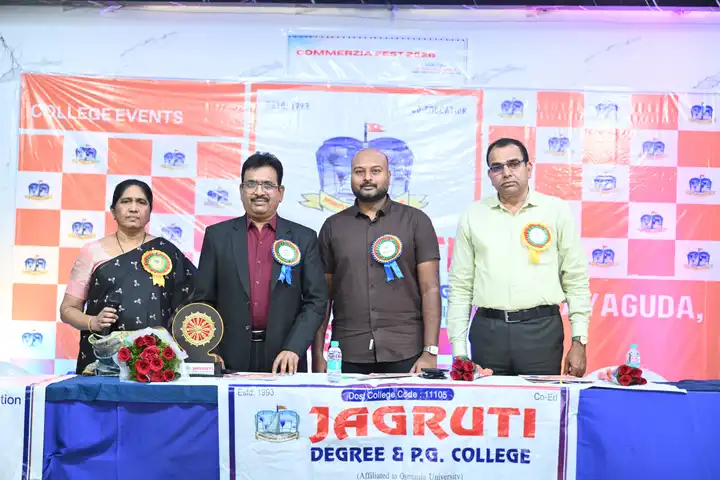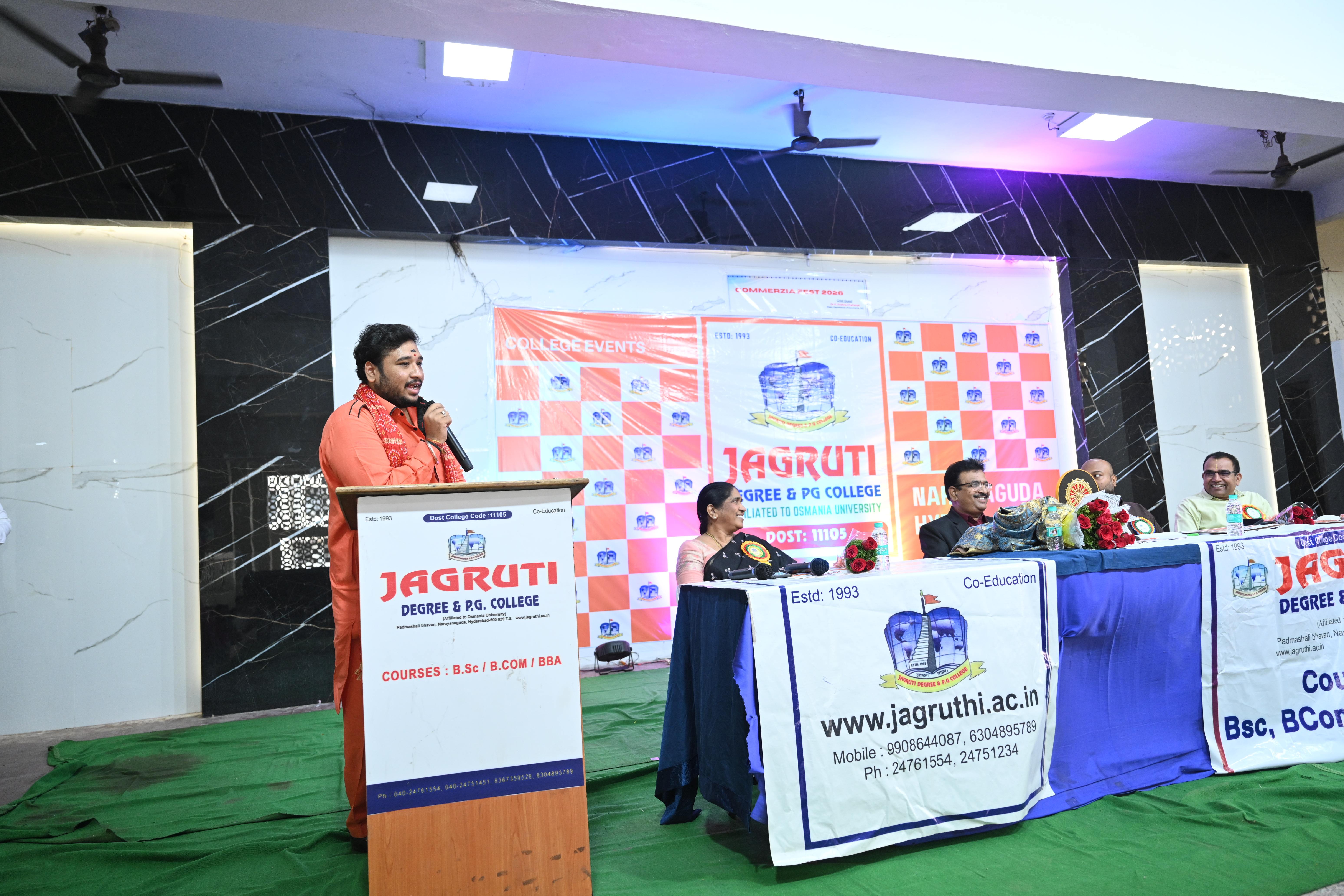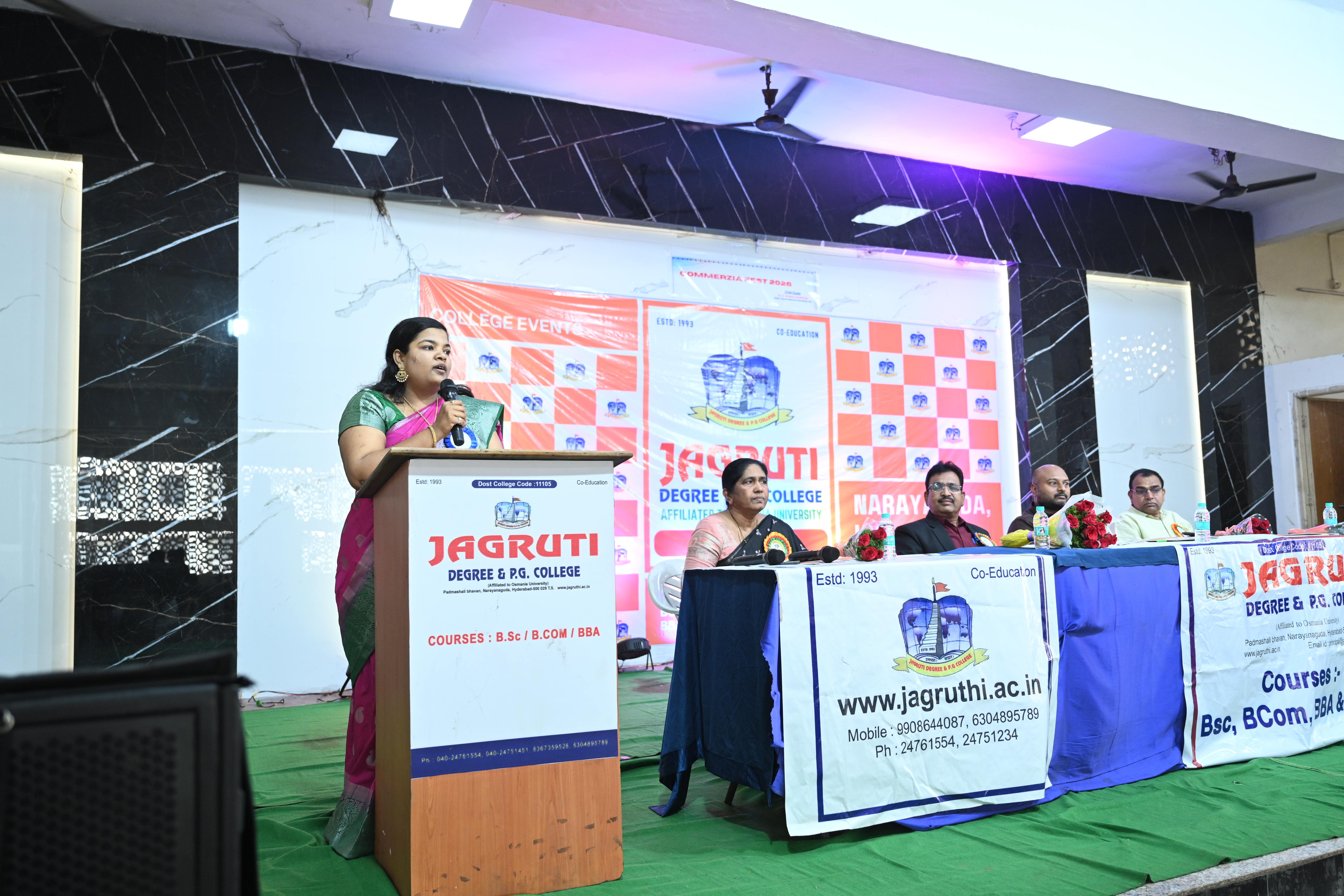 🎉 Fantastic Commerzia Fest hosted by BCom students and staff of Jagruti Degree and PG College on 28th February 2026 at Padmashali Bhavan, Narayanaguda. BCom Students have presented projects and fun activities stalls for the Chief Guest Dr. K. Krishna Chaitanya (Dean, Department of Commerce) and also performed with many dance performances and skits on real world topics.