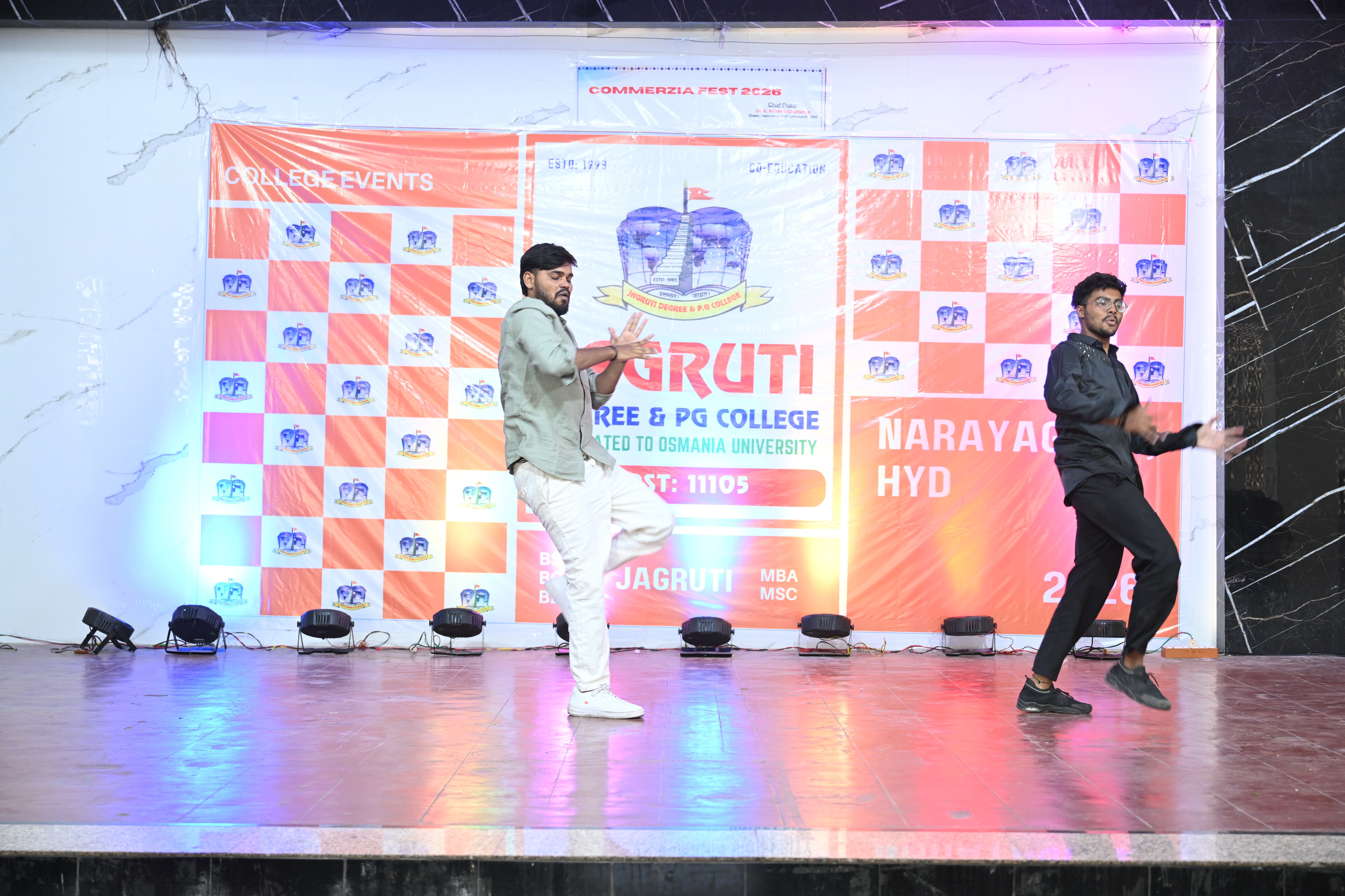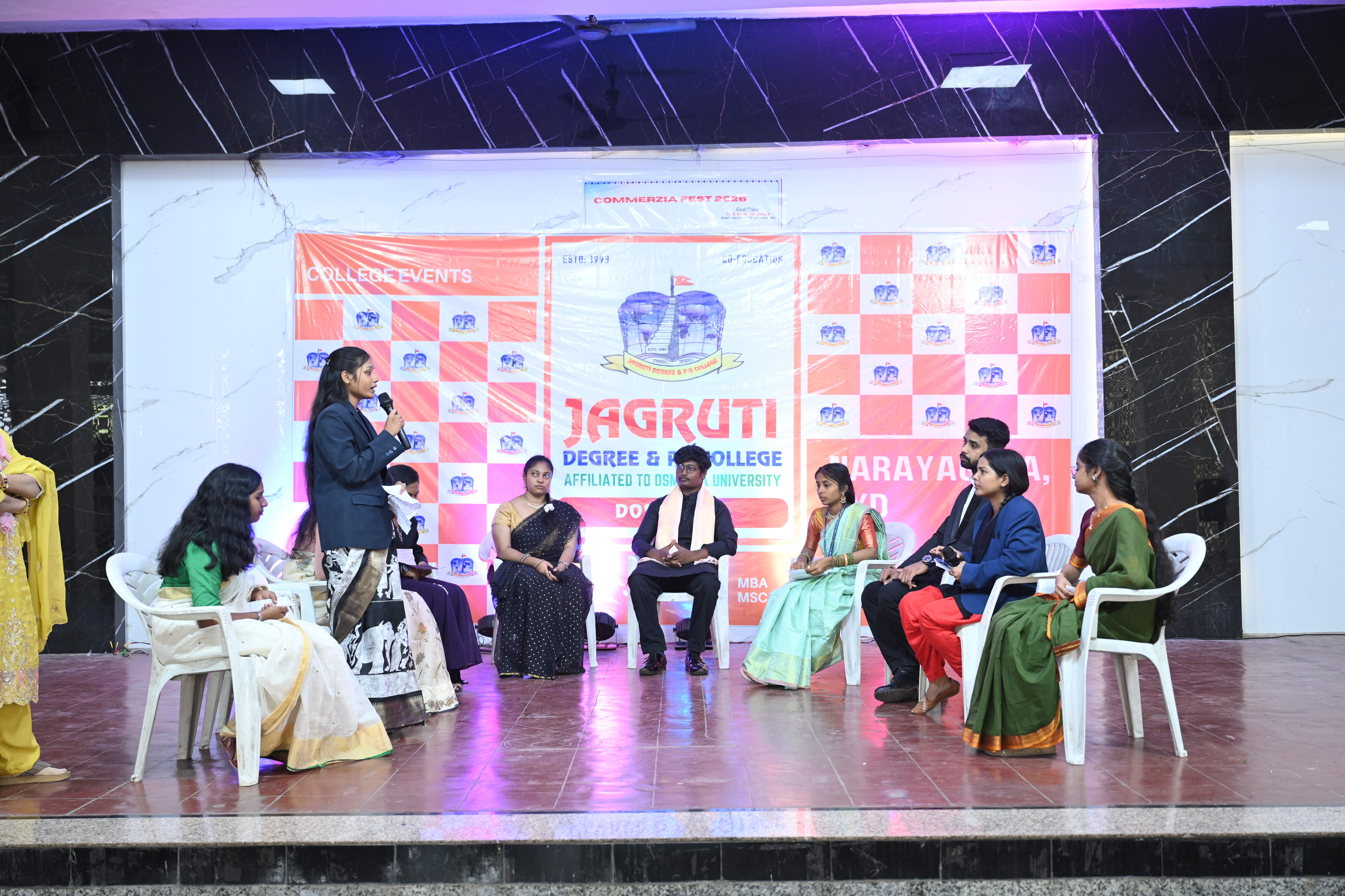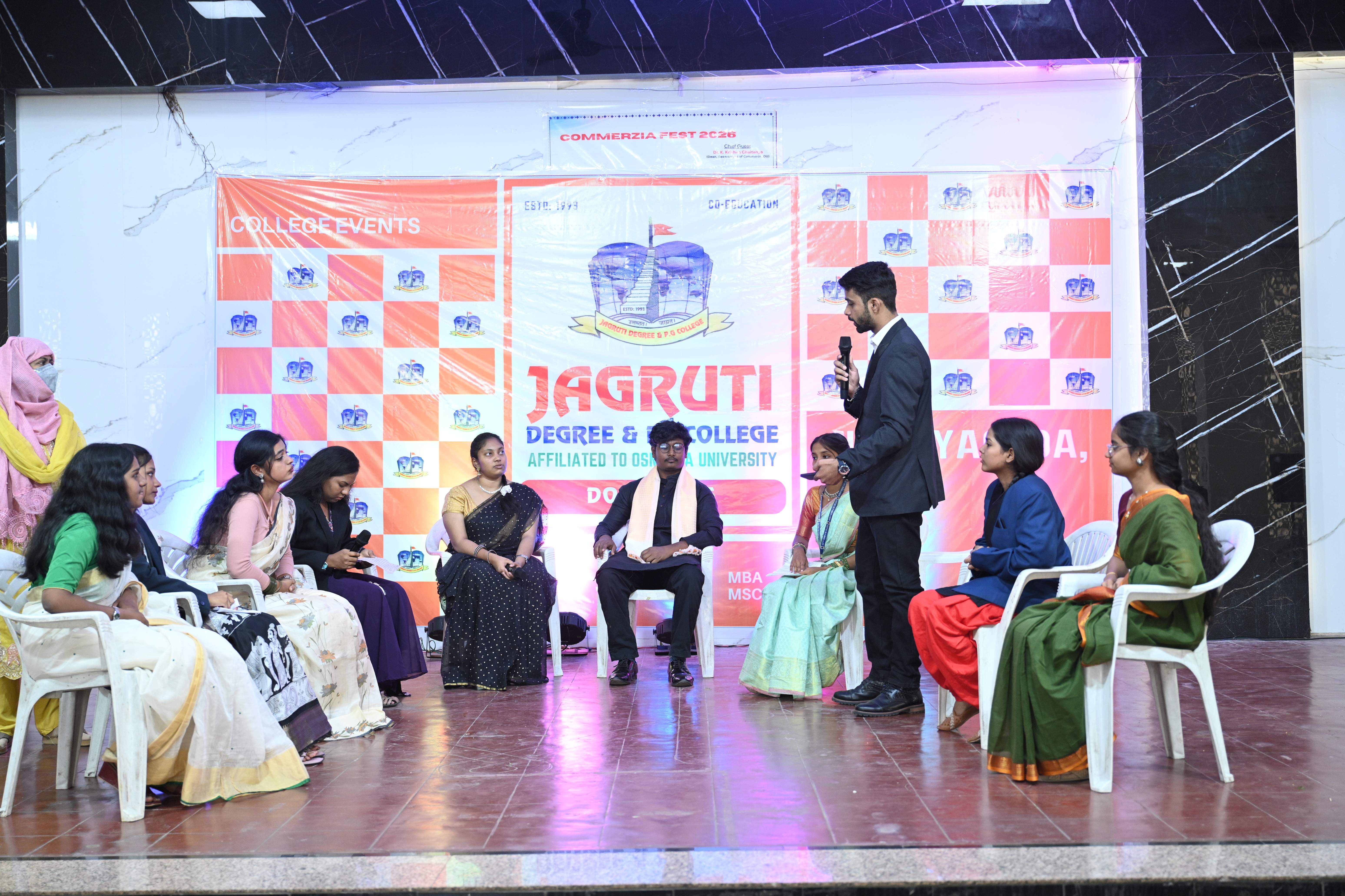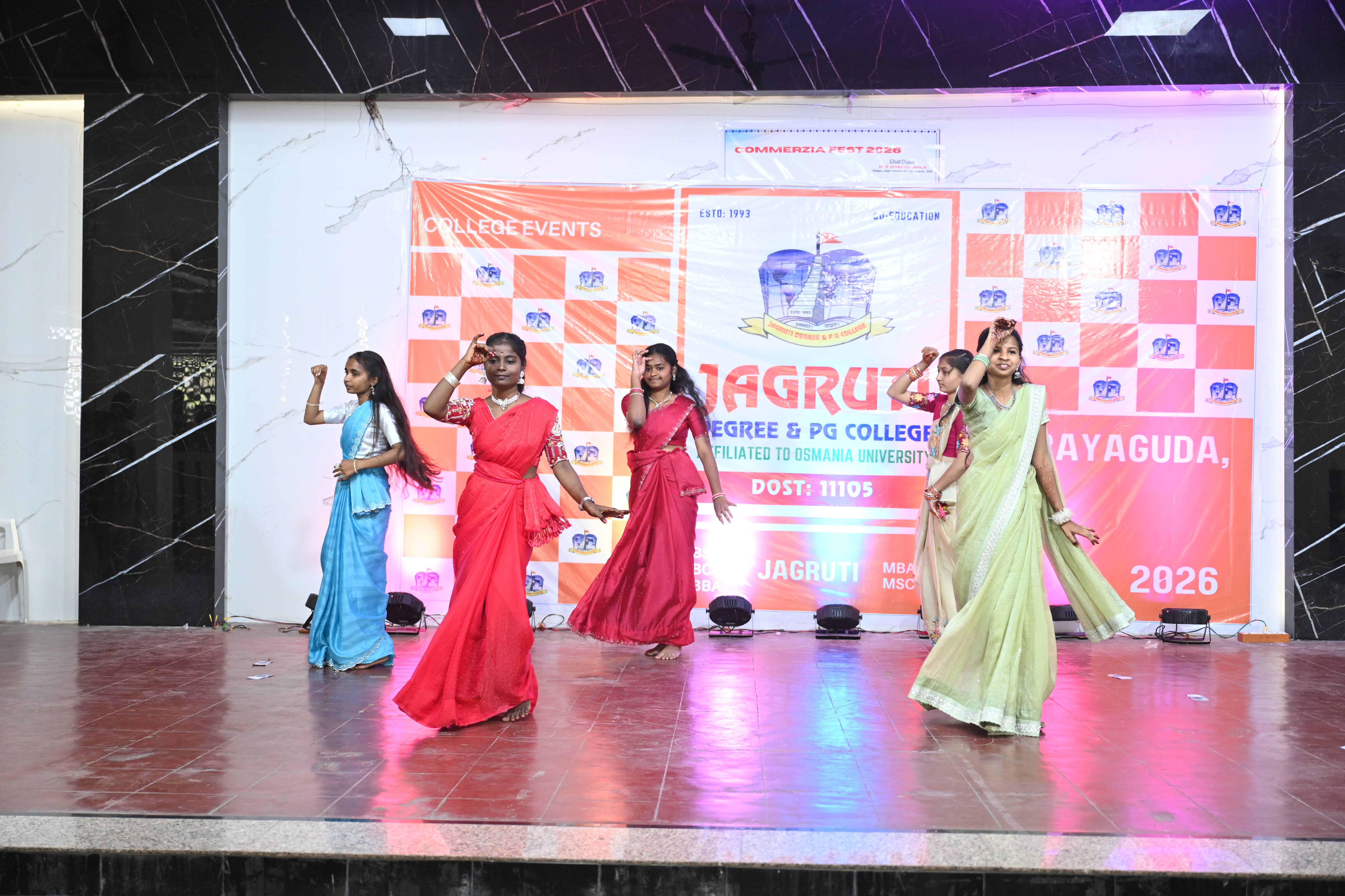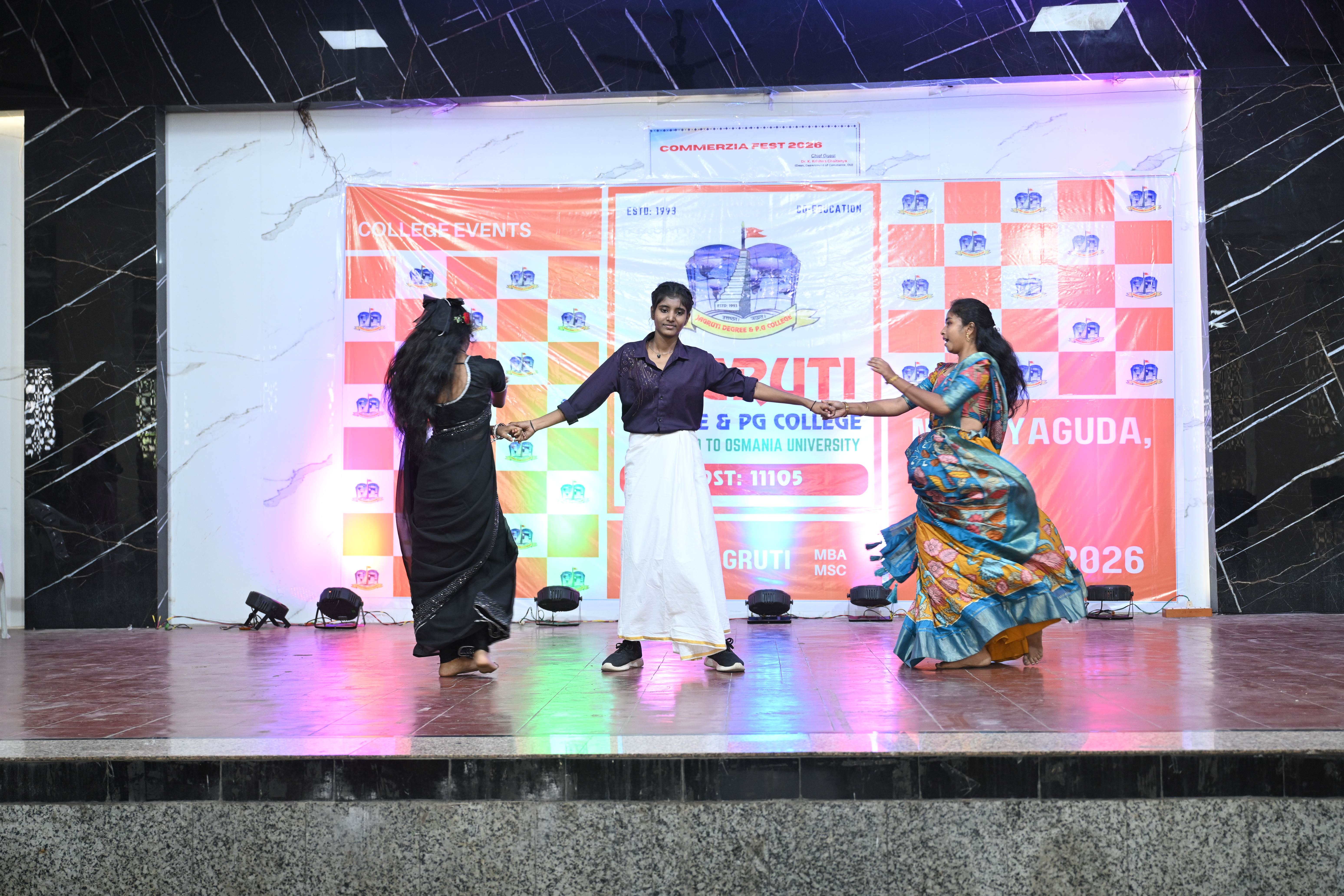 🎉 Fantastic Commerzia Fest hosted by BCom students and staff of Jagruti Degree and PG College on 28th February 2026 at Padmashali Bhavan, Narayanaguda. BCom Students have presented projects and fun activities stalls for the Chief Guest Dr. K. Krishna Chaitanya (Dean, Department of Commerce) and also performed with many dance performances and skits on real world topics.